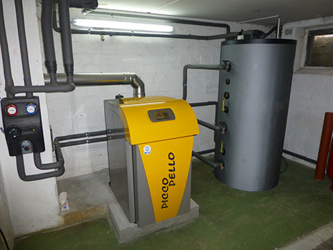 Pelletkessel PiccoPello mit einem Saugsystem, das die Pellets aus einem anderen Gebäude durch eine Erdleitung ansaugt