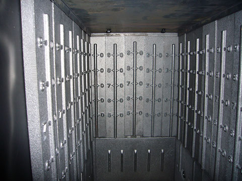 Blick in den Füllraum mit 150 Litern Volumen von einem Turbomax-Holzvergaserkessel mit 15 - 30 kW Leistung. Die Paneele sind aus Grauguss mit maximaler Verschleißfestigkeit.