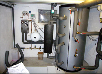 Das Herzstück einer nachhaltigen Wärmeversorgung in einem Einfamilienhaus – Ein Schichten-Pufferspeicher mit 1000 L Volumen angeschlossen an einen Pelletkessel, eine Sonnenkollektoranlage mit 16m², ein wassererwärmender Kaminofen versorgen 2 Wohnungen mit Heizwasser und eine Felix-Frischwasserstation bereitet hygienisch frisch das Warmwasser nur wenn es benötigt wird.